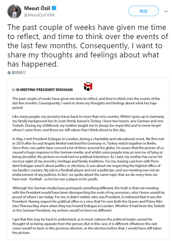 厄齐尔回应合影土耳其总统 只是对血脉根源心怀敬意无政治意义 体育 腾讯网