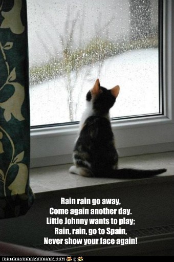 Rain Rain Go Away Come Again Another Day Little Johnny Wants To Play Rain Rain Go To Spain Never Show Your Face Again Lolcats Lol Cat Memes Funny